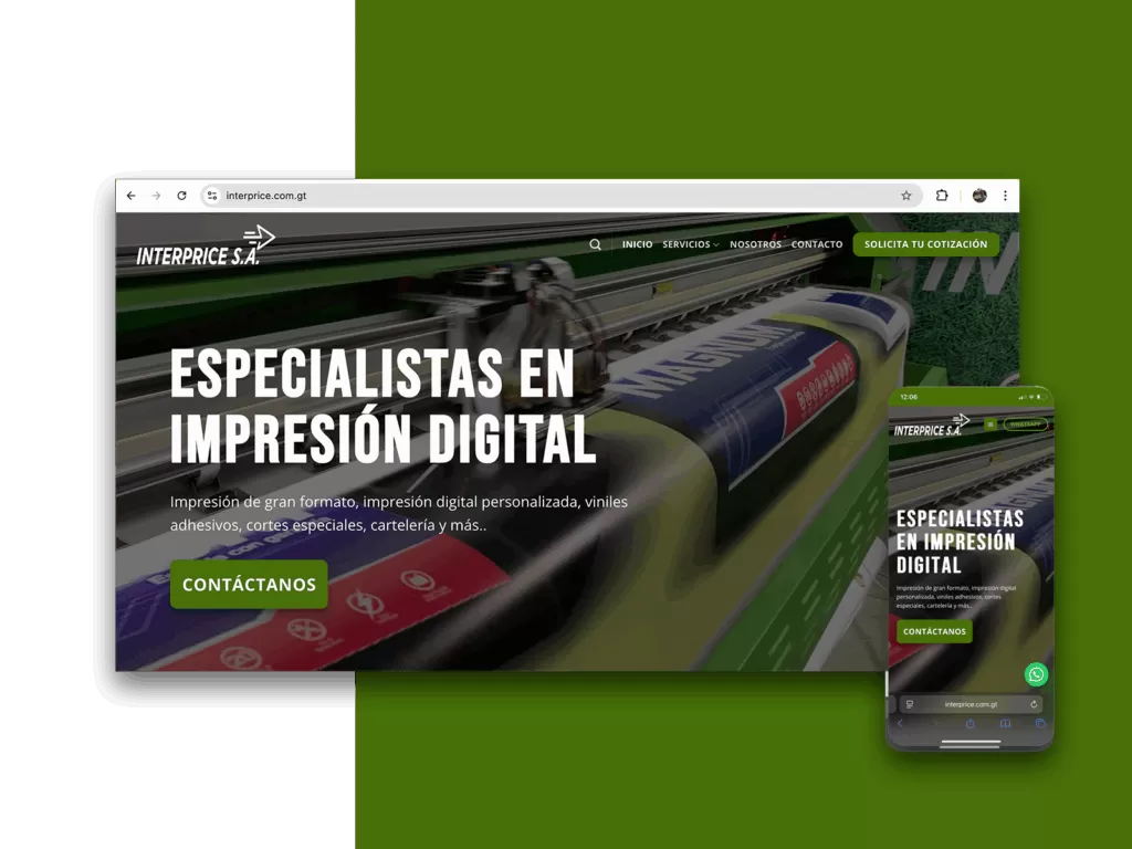 El sitio web de Interprice es una plataforma corporativa que refleja la experiencia y profesionalismo de la empresa guatemalteca especializada en impresión digital de gran formato y soluciones publicitarias. Con un diseño moderno y funcional, el sitio facilita a los usuarios la exploración de servicios y la solicitud de cotizaciones de manera eficiente.